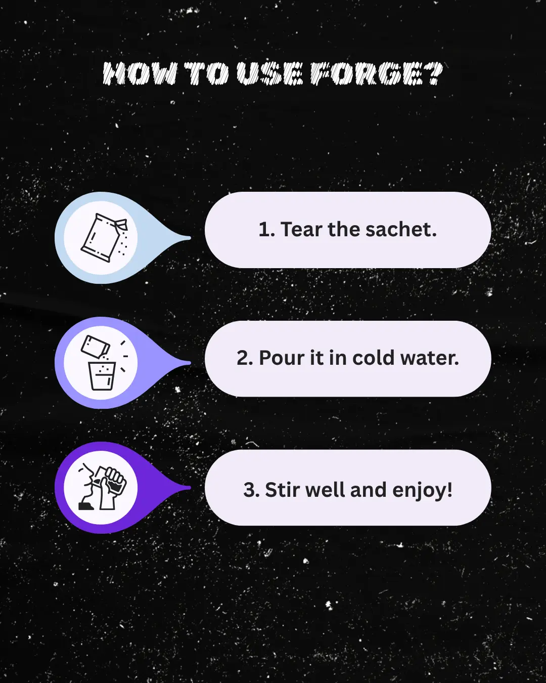 Mix one sachet with 250-300ml of ice-cold water. Shake or stir. Consume 10-20 minutes before you need to unleash hell.